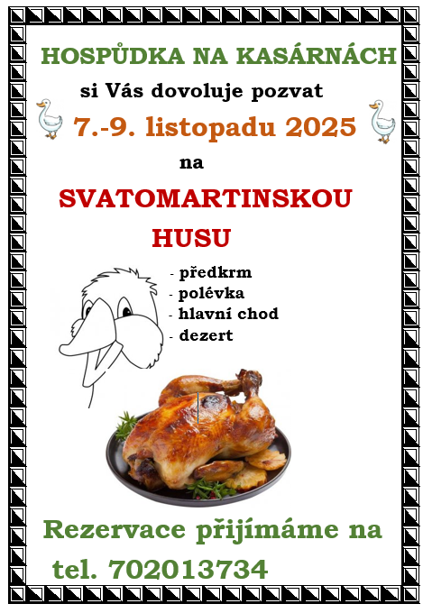 SVATOMARTINSKÁ HUSA - předkrm, polévka, hlavní chod, dezert. Konkrétní jídelníček již brzy. Rezervace přijímáme na tel. čísle +420 702 013 734