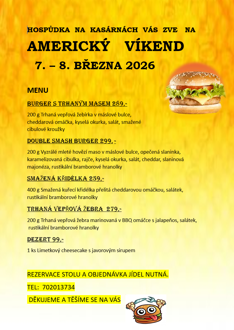 Americký víkend - srdečně Vás zveme na americký víkend. Nutná rezervace na tel. čísle 702 013 734.