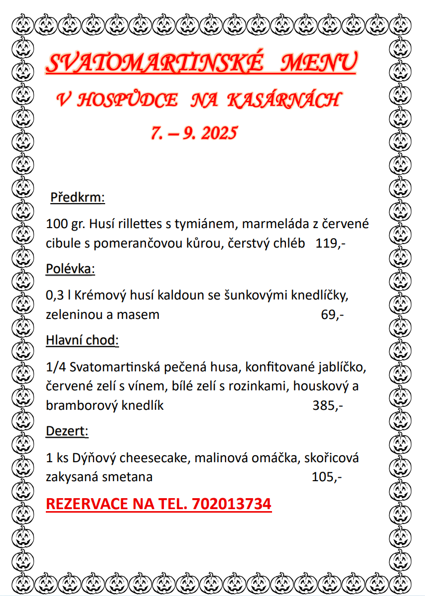 SVATOMARTINSKÁ HUSA - předkrm, polévka, hlavní chod, dezert. Rezervace přijímáme na tel. čísle +420 702 013 734